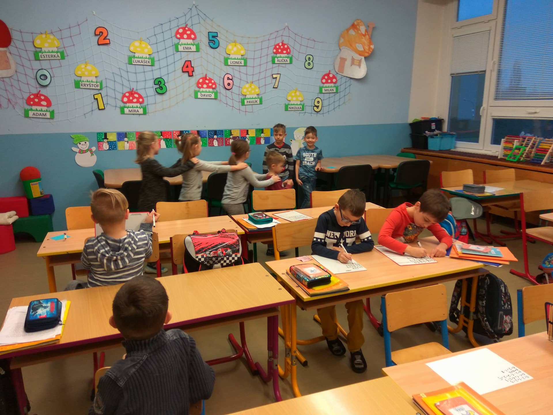 hlavně.... Začínáme psát do písanky psacím písmem. Všichni pilně trénují a moc