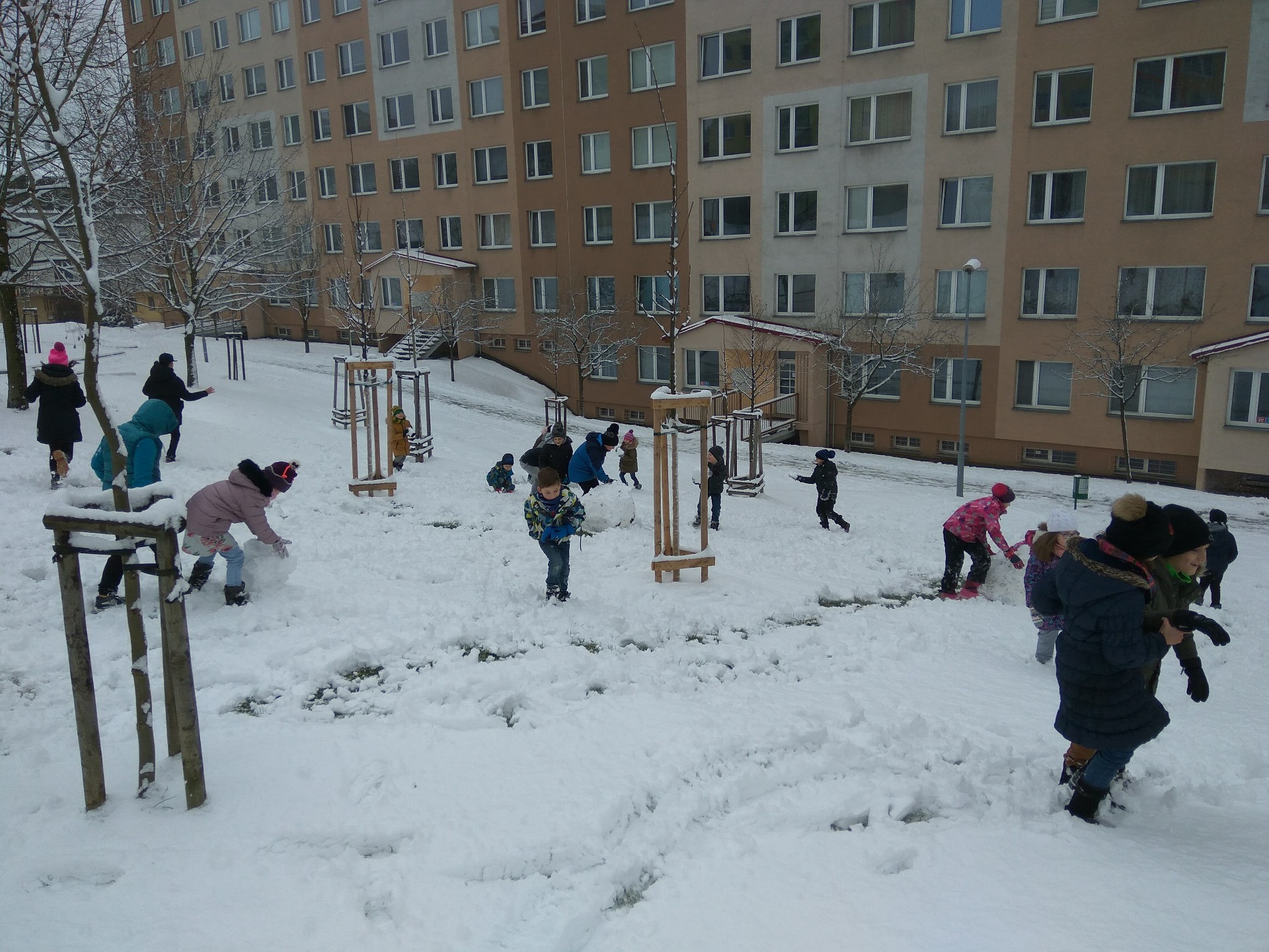 Cestou z oběda nám počasí přálo, a tak jsme si udělali malou přestávku a využili sněhové nadílky ke stavbě sněhuláků a koulování.