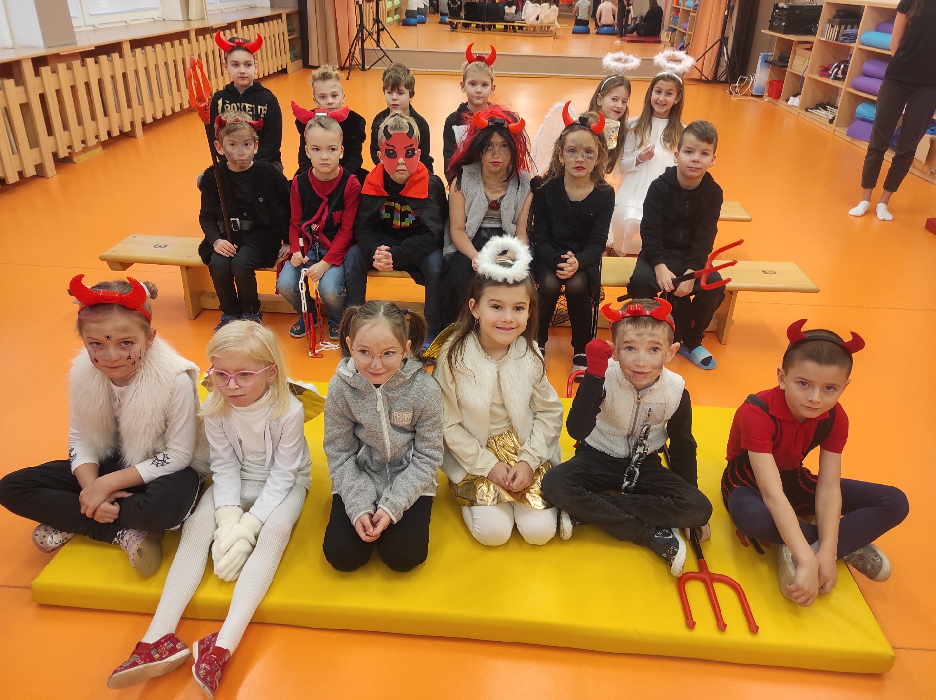 Na začátku prosince jsme si užili další projektový den, kdy jsme se ve škole sešli převlečeni za čerty a andílky. Ve třídě jsme plnili různé pekelné úkoly. V matematice např. počítali čerty a tvořili s nimi slovní úlohy. V hodině českého jazyka jsme luštili křížovku a dávali dohromady jména čertů. Dále jsme tančili, malovali peklo, kreslili čerta, z papíru skládali Mikuláše. Nejvíce se nám líbilo vystoupení studentů ze střední pedagogické školy. Dozvěděli jsme se, jak to chodí v "Hodném pekle", naučili se čertovský tanec, zazpívali koledy a nechyběla ani Mikulášská nadílka.