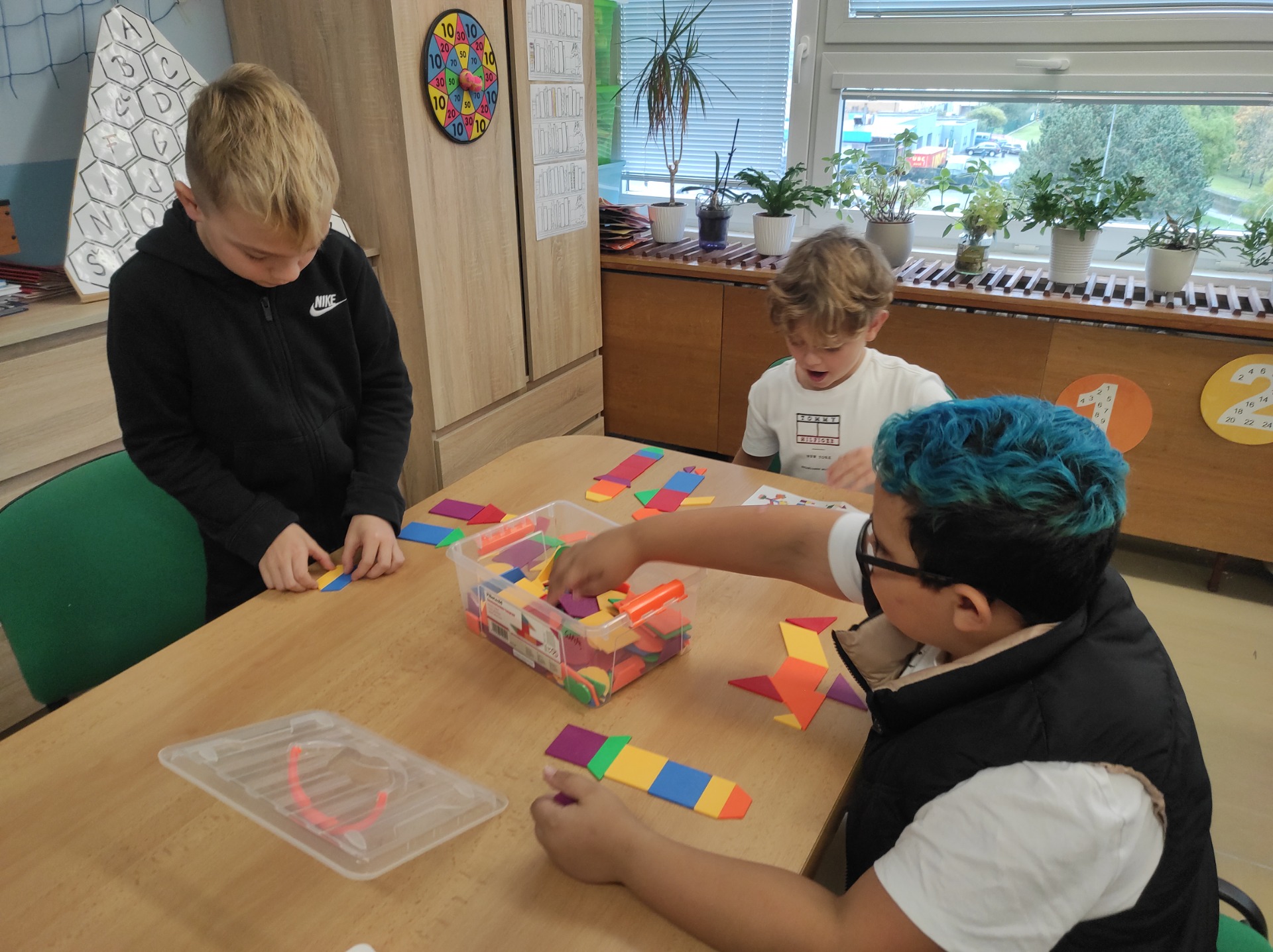 V hodinách geometrie probíráme tvary. Hlavičky nám zamotal úkol, v kterém jsme měli sami vyhledávat, zakreslovat a určovat geometrické tvary. Nakonec jsme pomocí plastových pomůcek vše rozšifrovali a poté už jsme se pustili do mnohem těžších úkolů, které jsme hravě zvládli.