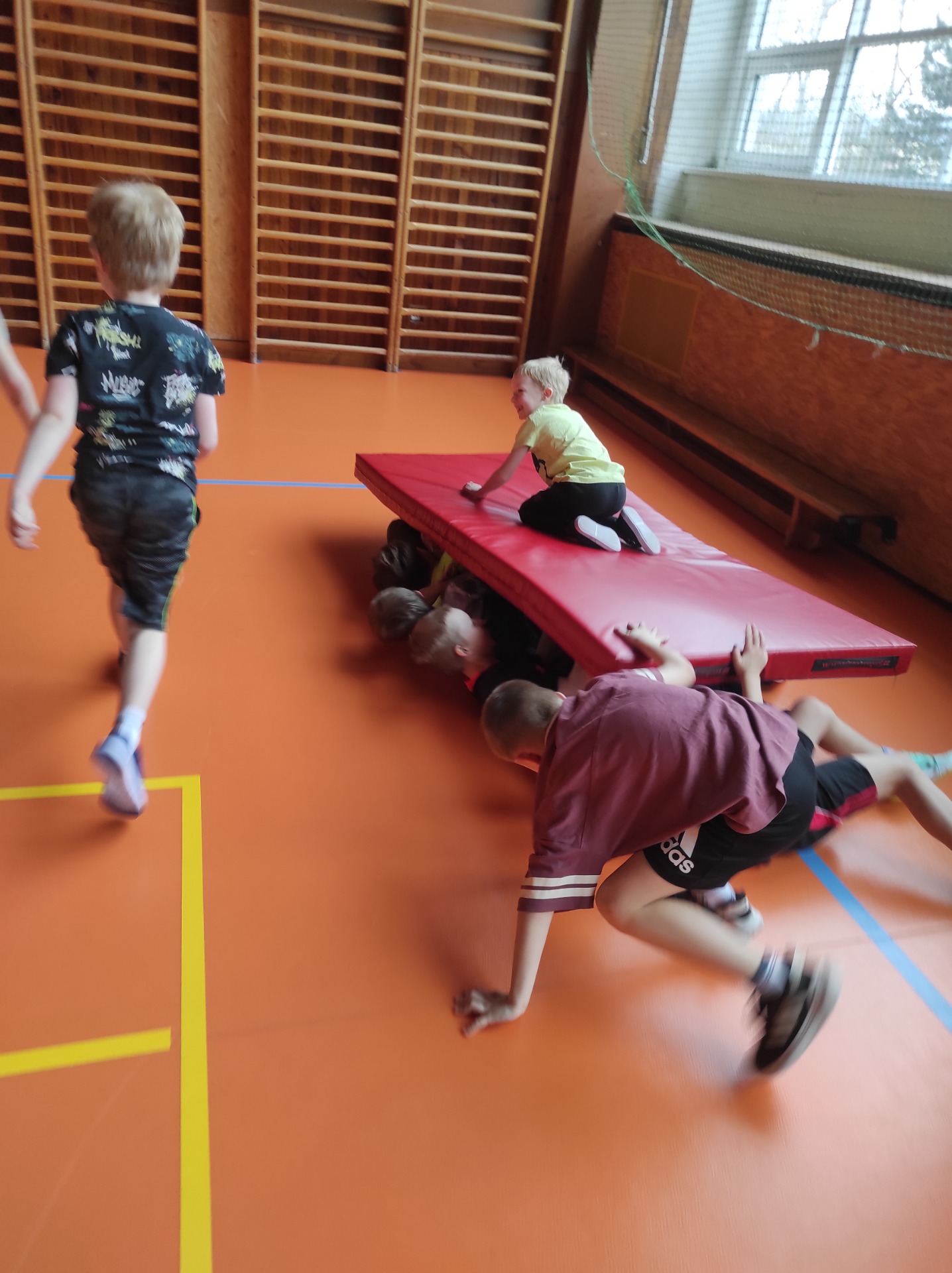 V únoru proběhla v 1. třídě zábavná hodina tělesné výchovy, která se nesla ve znamení pohybu, spolupráce a radosti. Hlavní roli tentokrát sehrály žíněnky, ze kterých se během chvíle staly ostrovy, hory i bezpečné přistávací plochy.