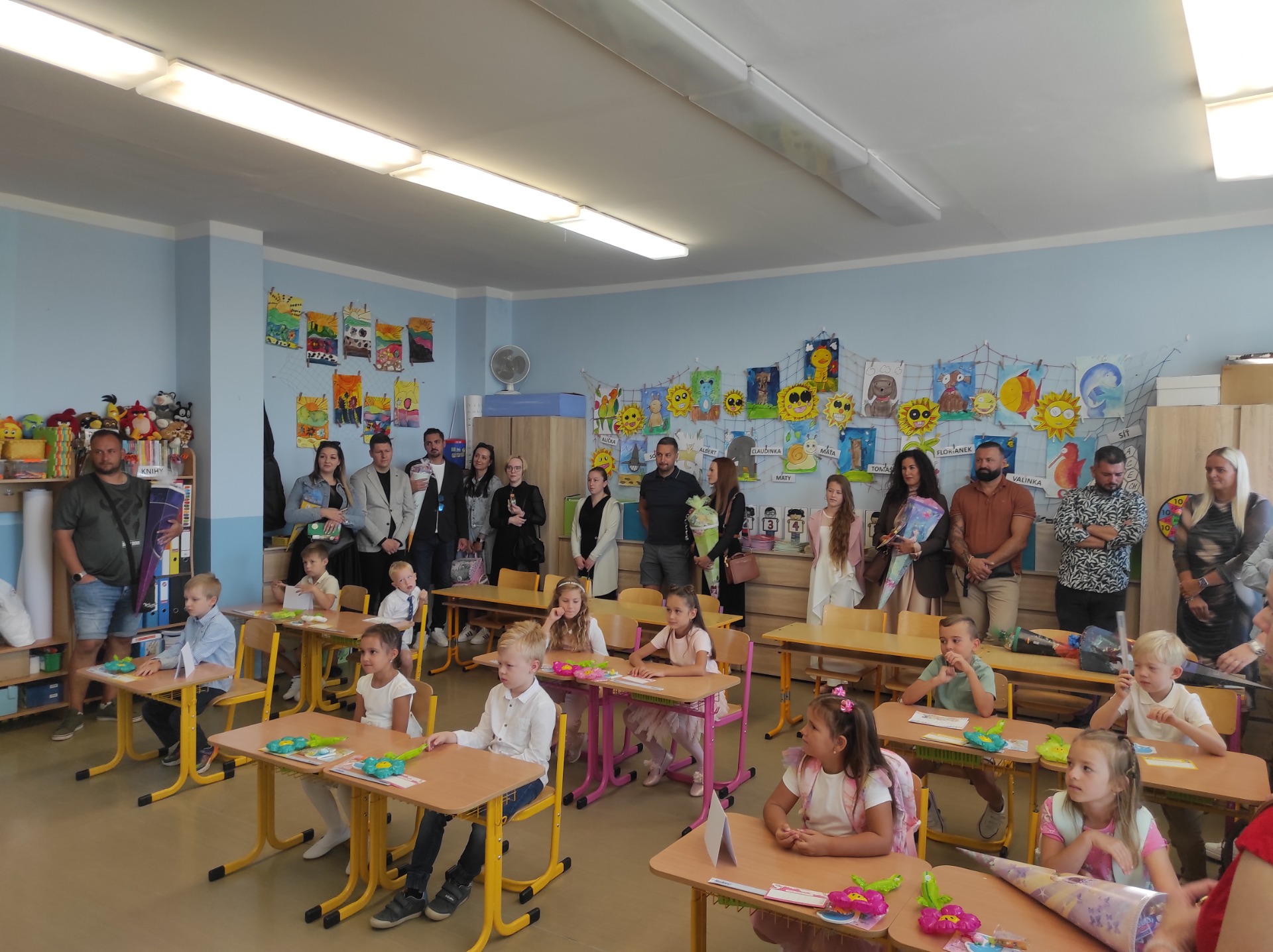 Po oficiální části se prvňáčci společně s rodiči a paní učitelkou přesunuli do své nové třídy. Tam na ně čekalo první velké překvapení – seznámení s průvodci celého školního roku, kamarády Agátou, Matýskem a Oskarem. Ti se stanou jejich pomocníky, rádci a společníky při objevování písmenek, čísel i všech dalších školních dobrodružství.